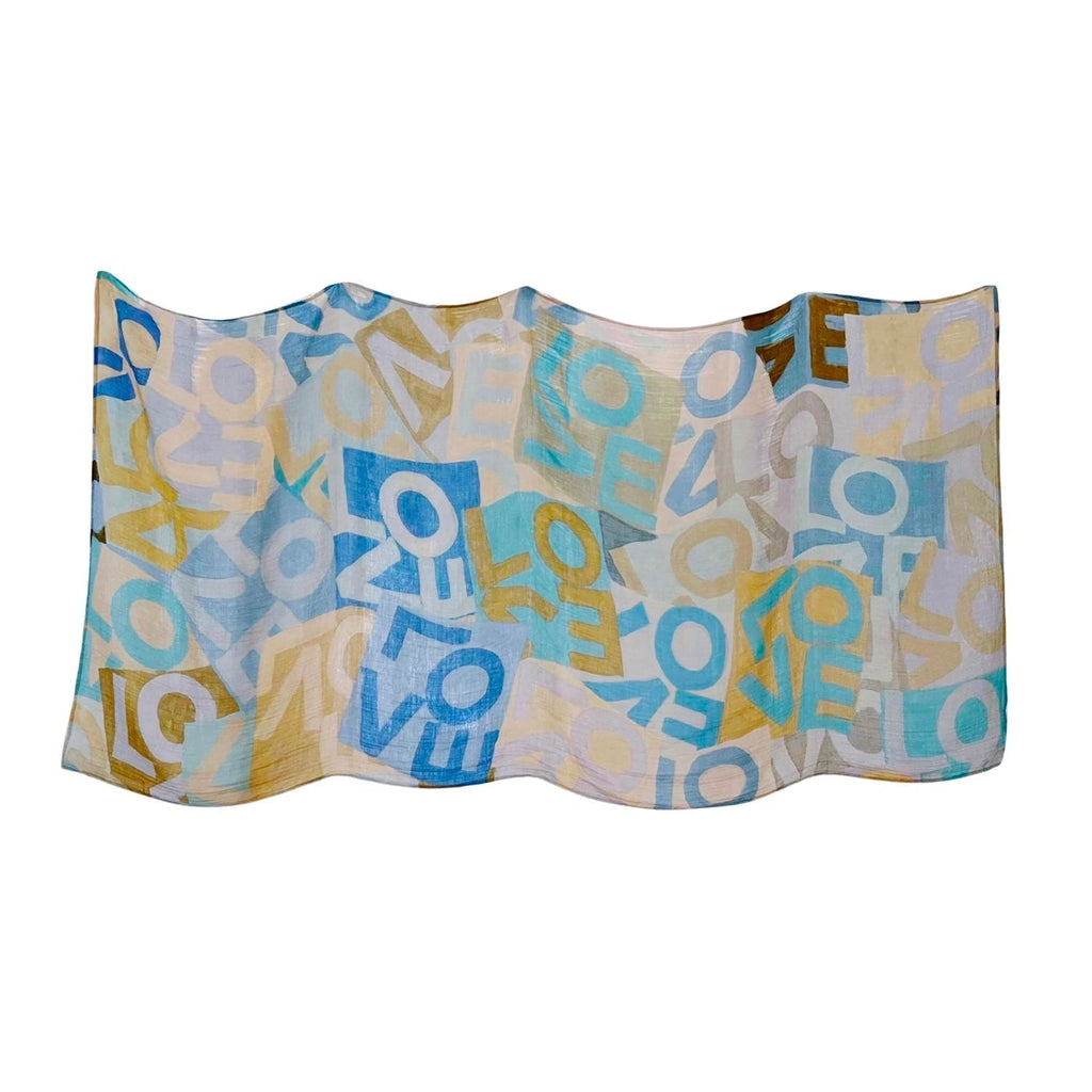 100% organic cotton muslin blanket covered in Sunny's LOVE Layers, and LovEvolve artwork. Produced using Azo Free Dyes on Fair Trade Fabrics, in an ethically principled factory. The inks are Azo free, GOTS (global organic textile standard) and Oeko-Tex certified, completely free from harmful chemicals and safe for human use, and there is zero waste.