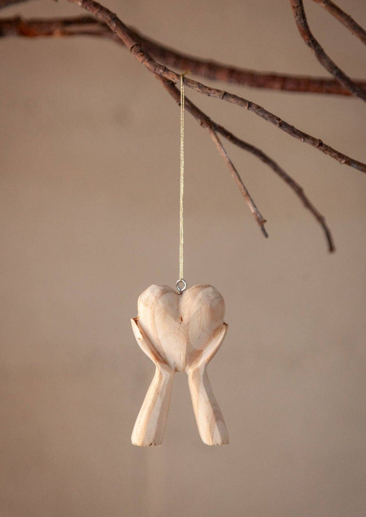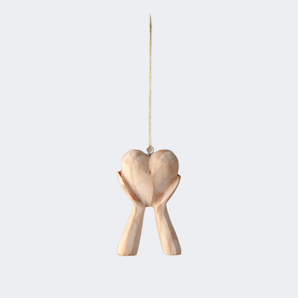 Our Wooden Hands Holding Heart Ornament is thoughtfully hand-carved from sustainably sourced pine, echoing the same artistry and intention found in our full-sized sculptures. Each piece is shaped by our skilled woodworkers, creating a small but meaningful reminder to slow down, connect, and surround your season with LOVE.