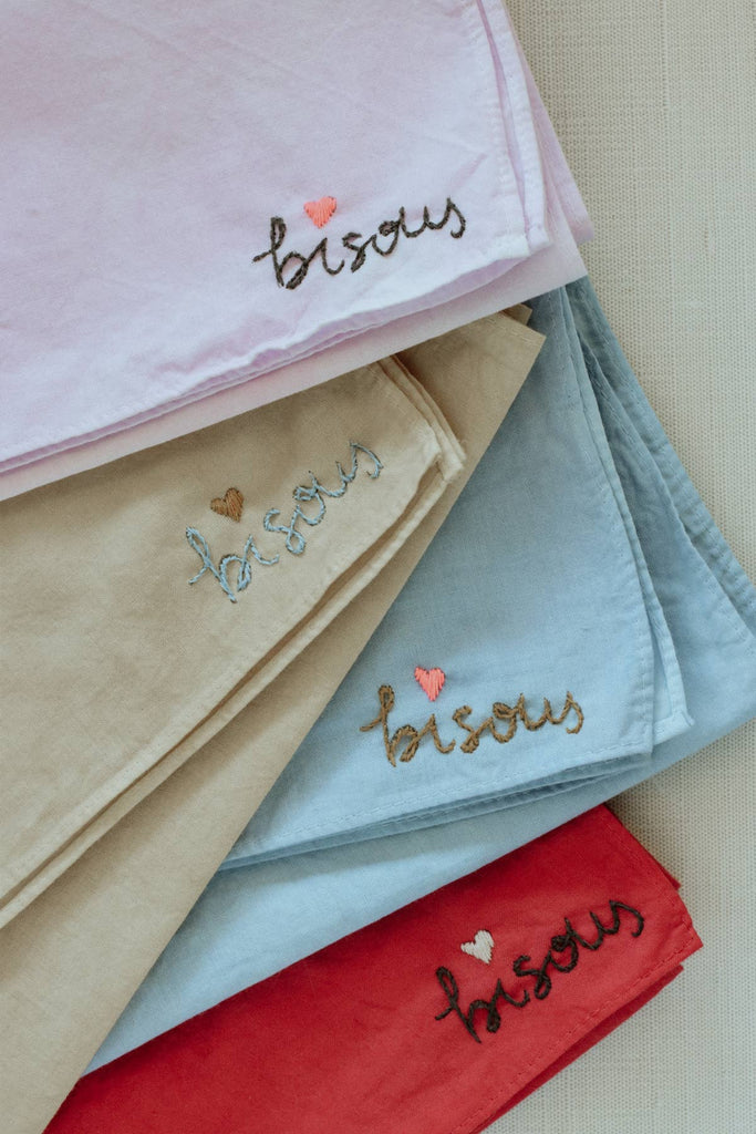 You can't get cuter with this eco friendly and hand dyed (with non toxic dyes) bandanas. These ones are ONE of a KIND since I hand embroider each one. These have the word Bisous (kisses) embroidered and a little heart, adorable! Each one is sold separately. Dyed by hand in smalll batches at my home studio in New Mexico, a really artisanal job in each piece, using NON toxic dyes. Measure 21x21 inches approx.