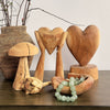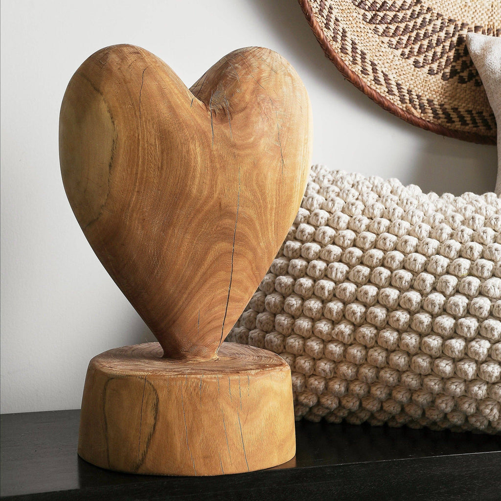 A classic and simple statement of love, this rustic African sculpture will add soul to any indoor or outdoor space. It is hand carved from a single piece of sustainably sourced Blue Gum wood, a form of eucalyptus found throughout southeast Africa. The species is invasive in South Africa, and systematic removal of the wood protects native forests, making the piece both beautiful and eco-friendly. The pieces polished to a raw, natural sheen, and the dense wood can also be displayed outdoors, weathering beautifully over time. Crafted to endure the test of time, these African sculptures mature with elegance, developing a captivating gray patina and acquiring unique, intricate cracks as the wood becomes increasingly resilient. Measurements Small - 11.5-13"H Large - 16-19
