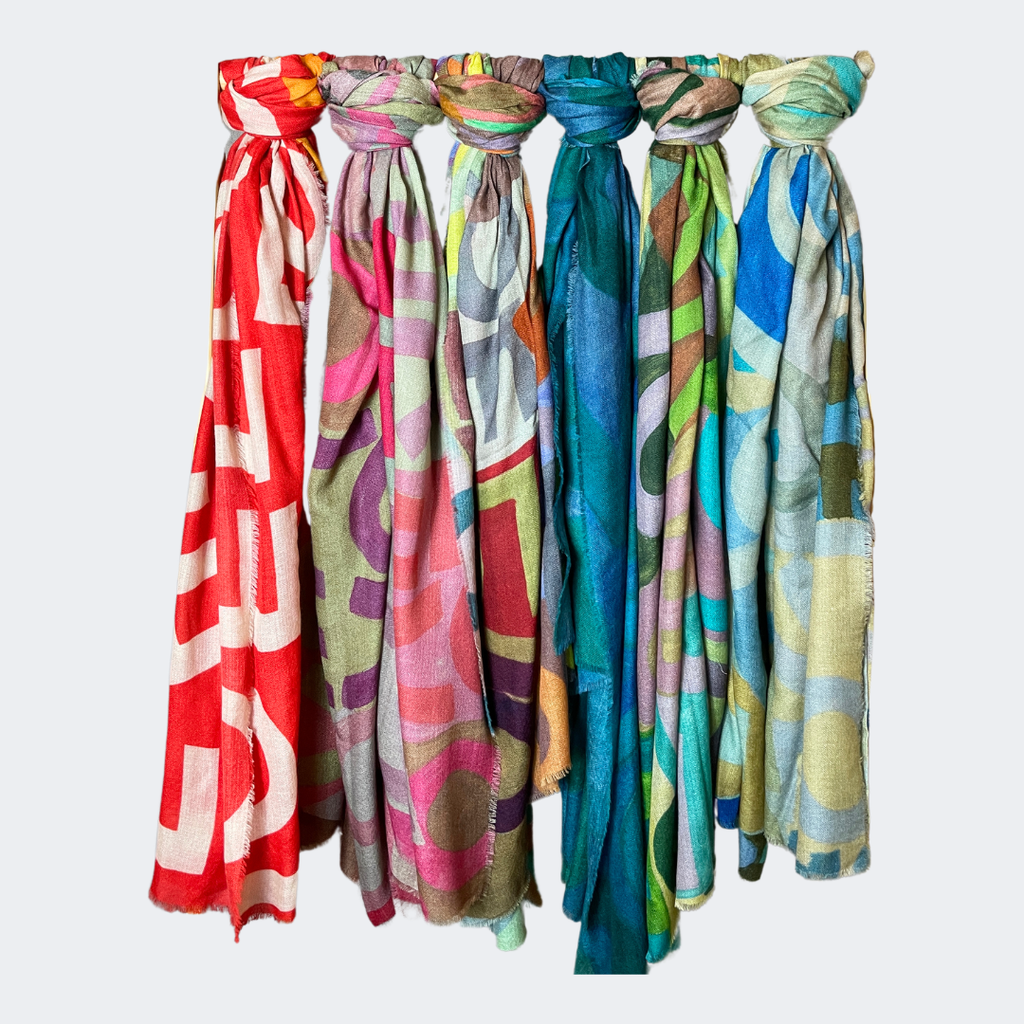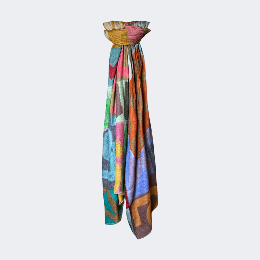 Designs on cashmere are muted in the vibrancy of the colors and this is not a mistake, it is characteristic of the process; further, the natural base of this fabric is beige which is the yarn in its natural form.